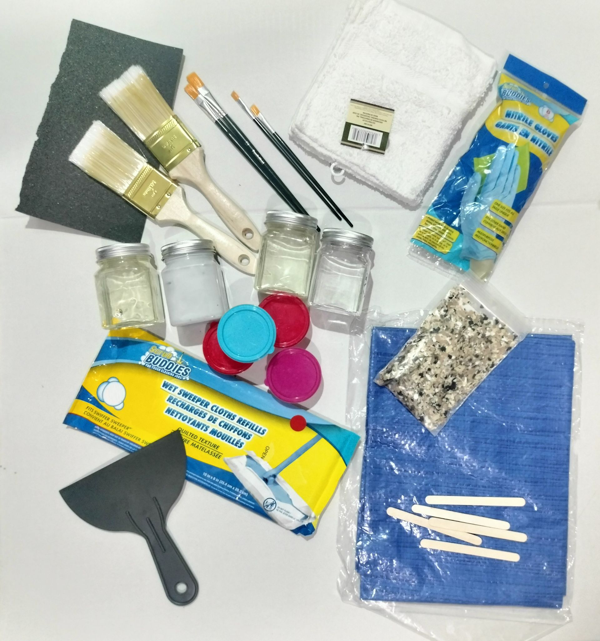 The kits also include Clear Coat (2 oz enough for about 2 square feet) of Fast Dry Polyaspartic Floor Coating (that is 100% compatible with epoxy), Mixing Sticks, Six Paint Brushes (Two Small Pointed Brushes and Two Small Flat Brushes, and Two Larger Flat Chip Brushes), Scraper for scraping over Flakes to remove jagged and sharp edges (if needed), Sand Paper to ruff up the concrete surface before coating, Degreasing Wipes for cleaning the concrete surface after you scuff it up with the Sand Paper, a blue Tarp to mix the product on and protect your floor with, Nitrile Rubber Gloves, Empty Mixing Containers, & Rags to Clean Up.